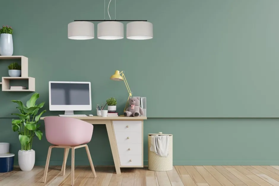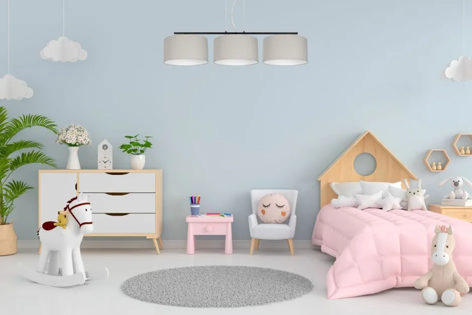 Die grauen Stoffschirme sind dekorativ und streuen das Licht diffus und blendarm in den Raum