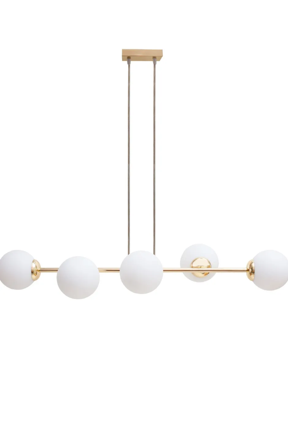 Qualität Made in EU Entdecke die zeitlose Eleganz der Pendelleuchte DEKUT, die mit ihrem modernen Design aus Metall und Glas in Gold jeden Raum zum Strahlen bringt. Mit einer Länge von 950 mm und einer Höhe von 1000 mm ist diese Leuchte ideal für hohe Decken und schafft eine einladende Atmosphäre über deinem Esstisch. Die satinierten Glaskugeln sorgen für ein warmes, weiches Licht, das nicht nur funktional ist, sondern auch das Ambiente in deinem Wohnzimmer, Esszimmer oder Arbeitszimmer aufwertet. Die DEKUT Pendelleuchte ist nicht nur ein Blickfang, sondern auch äußerst praktisch. Sie ist für den Innengebrauch (IP20) konzipiert und wird mit 230V betrieben. Mit Platz für bis zu fünf E27 Leuchtmittel (max. 60W) kannst du die Lichtstimmung ganz nach deinen Wünschen anpassen. Ob du ein gemütliches Dinner mit Freunden planst oder einfach nur eine entspannte Lesestunde im Wohnzimmer genießen möchtest – diese Esstischlampe bietet dir die Flexibilität, die du benötigst. Die stilvolle Aufhängung über ein selbsttragendes Kabel an einer Schwebeplattform verleiht der Lampe eine schwebende Leichtigkeit, während die hochwertige Verarbeitung „Made in EU“ für Langlebigkeit und Qualität steht. Die DEKUT Pendelleuchte ist die perfekte Wahl für alle, die Wert auf Design und Funktionalität legen. Setze Akzente in deinem Zuhause mit dieser exquisiten Pendelleuchte und genieße die harmonische Verbindung von Licht und Stil. Lass dich von der DEKUT inspirieren und verwandle deine Räume in ein elegantes Wohnambiente.