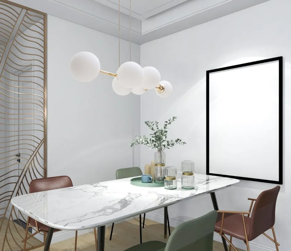 Die satinierten Glaskugeln sorgen für warmes und weiches Licht über dem Esstisch