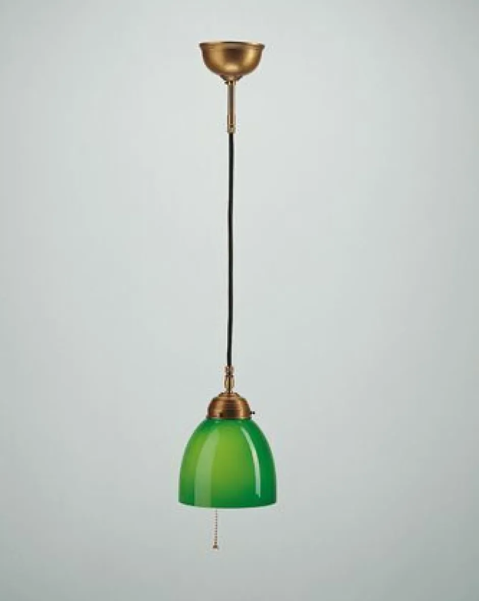 Der grüne Schirm aus Glas ist ein auffälliger Hingucker und streut das Licht blendarm für ein wohnliches Ambiente in Wohnzimmer, Esszimmer und Küche