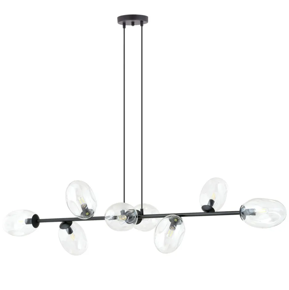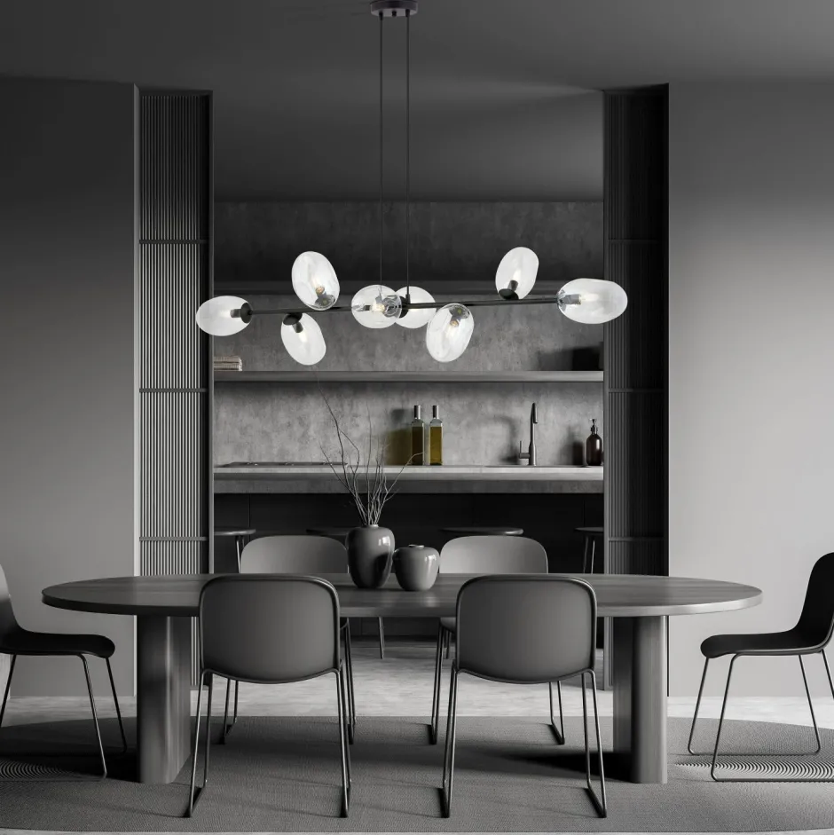 Die längliche Hängeleuchte sorgt für eine direkte Beleuchtung und passt ideal über den Esstisch
