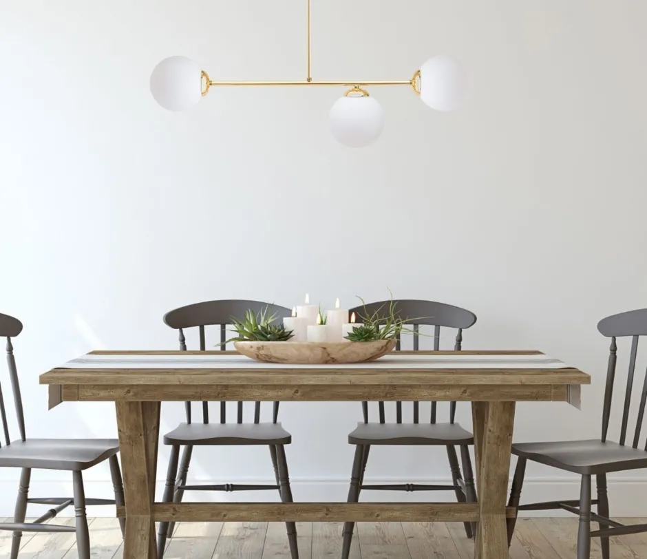 Die satinierten Glaskugeln sorgen für warmes und weiches Licht über dem Esstisch