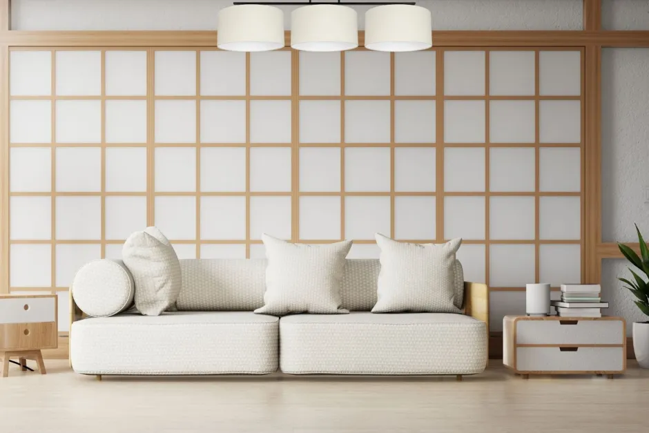 Die Stoffschirme in Ecru sind dekorativ und streuen das Licht diffus und blendarm in den Raum