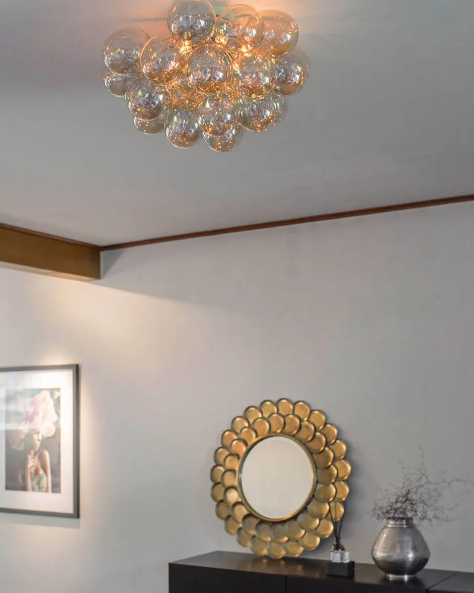 Die kunstvollen Schirme aus Rauchglas sorgen für einen edlen Look, der aus der Deckenleuchte einen dekorativen Blickfang macht