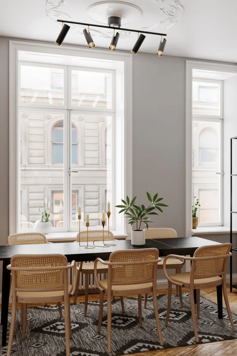 Die Schirme der Deckenleuchte sind dreh- und schwenkbar, was eine gezielte Beleuchtung erlaubt – für Licht genau da, wo es benötigt wird