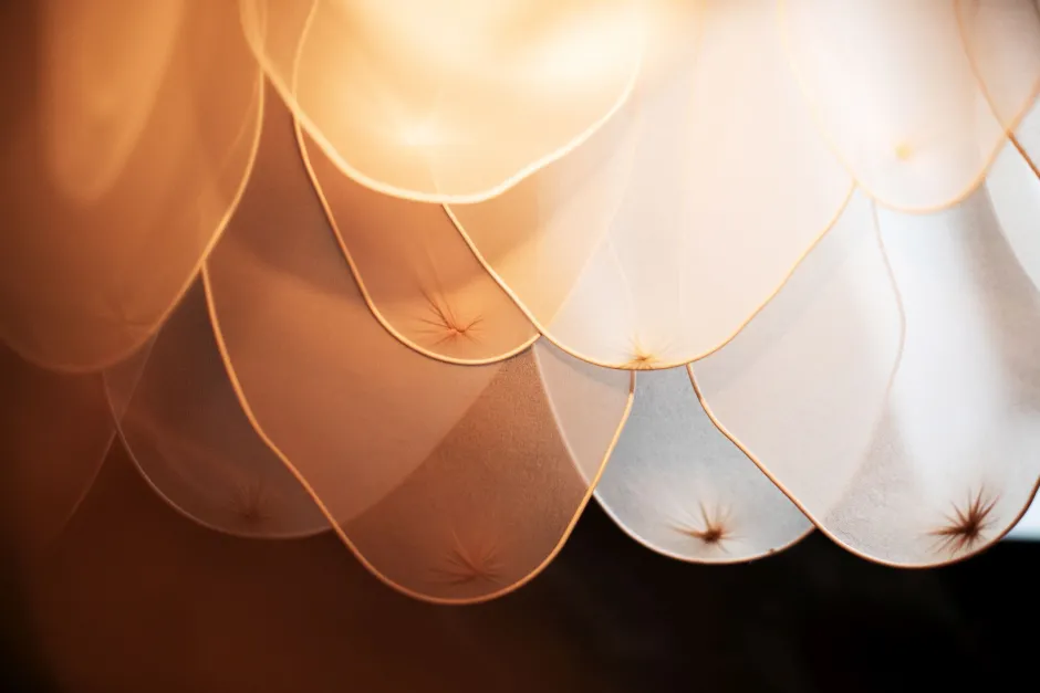 Die biegsamen Stoffblätter erwecken nicht nur den Eindruck einer Blüte in ihrer vollen Pracht, sondern sie erlauben auch eine individuelle Gestaltung der Hängelampe – ein einzigartiger Blickfang für Schlafzimmer, Wohnzimmer und Esszimmer