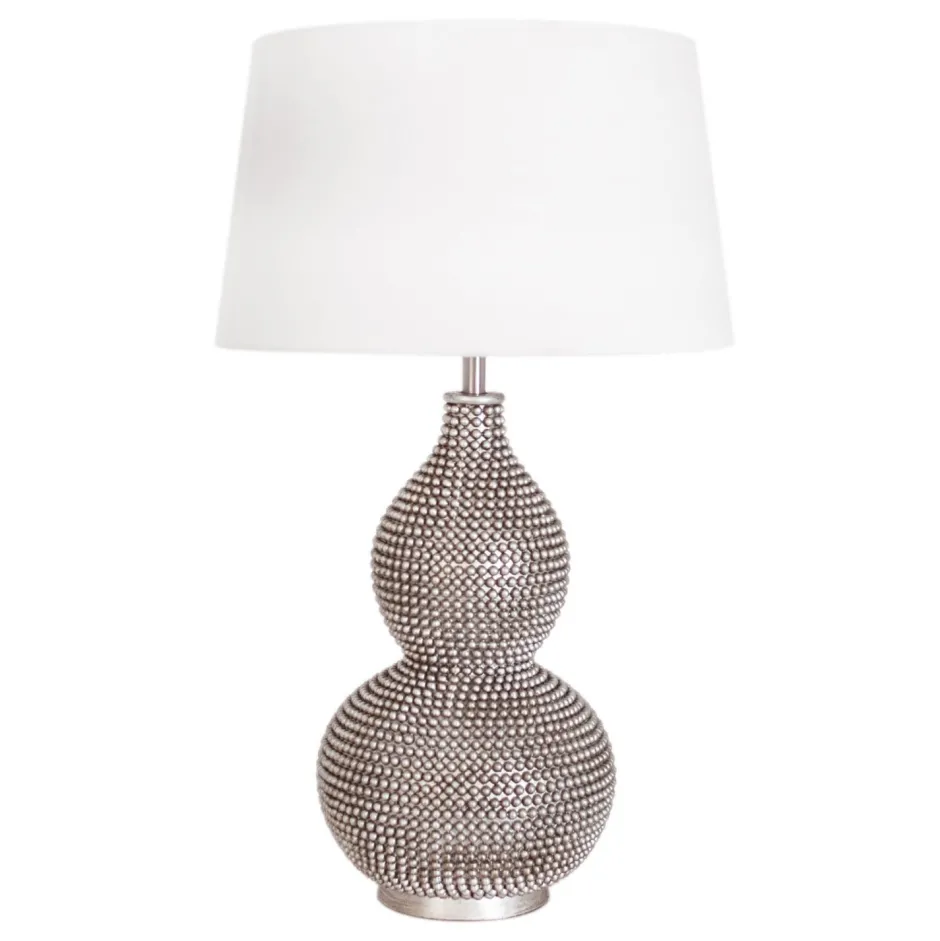 Große Tischlampe mit Stoffschirm und kunstvollem Fuß