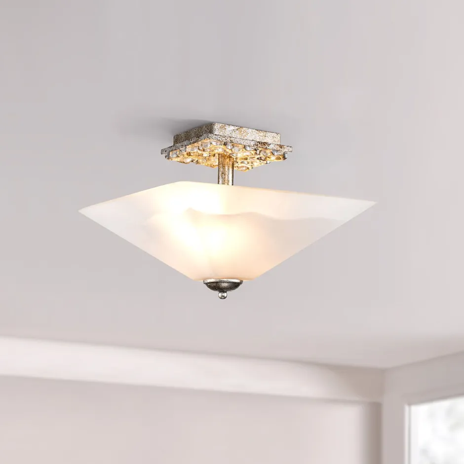 Details in Silber antik unterstreichen den edlen Charakter und verleihen der Deckenlampe einen dekorativen Look – ein absoluter Blickfang in jedem Raum