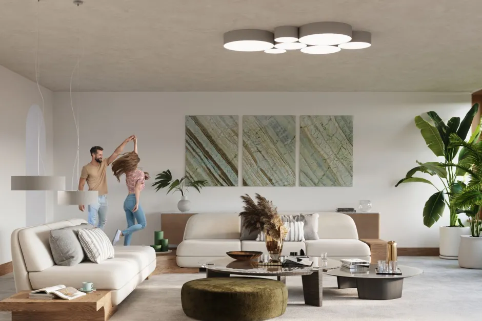 Dank ihrer geringen Höhe passt die Deckenlampe auch in Räume mit niedrigen Decken