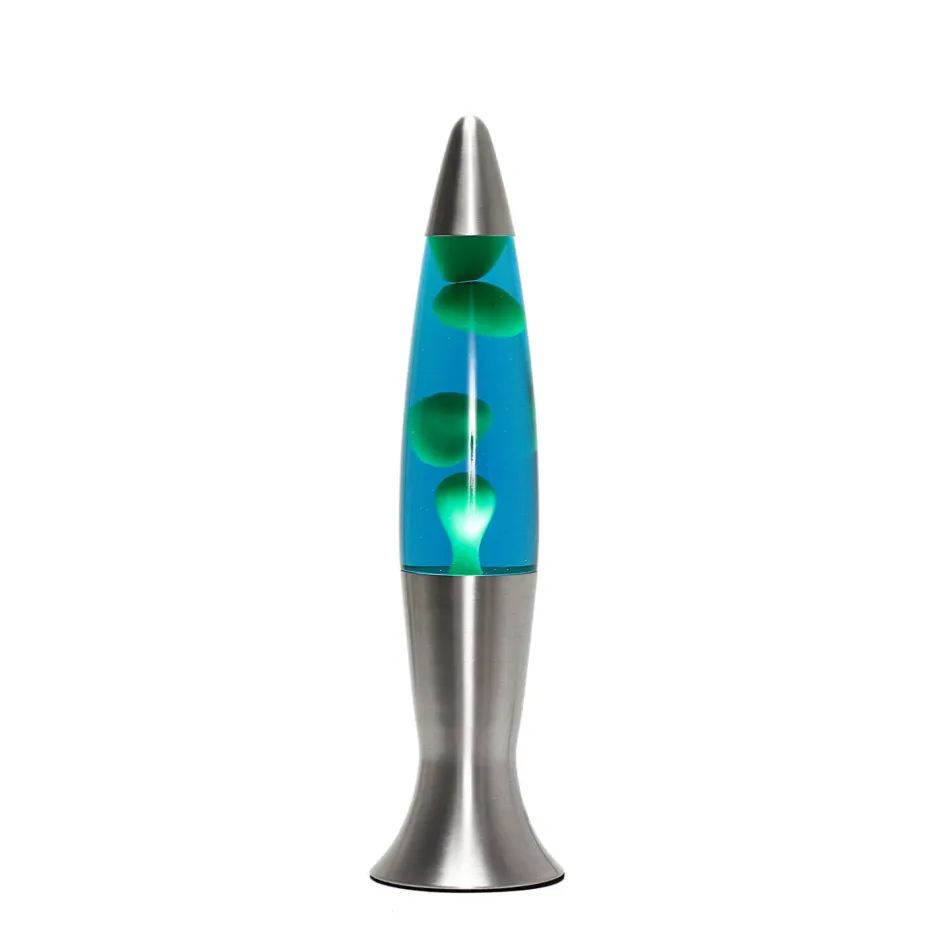 Die dekorative Tischleuchte strahlt dank dem Auf- und Absteigen der grünen Wachs-Blasen in blauer Flüssigkeit eine beruhigende Wirkung aus.