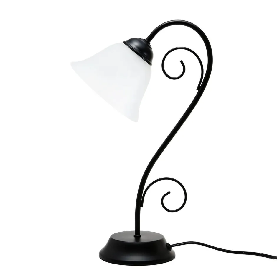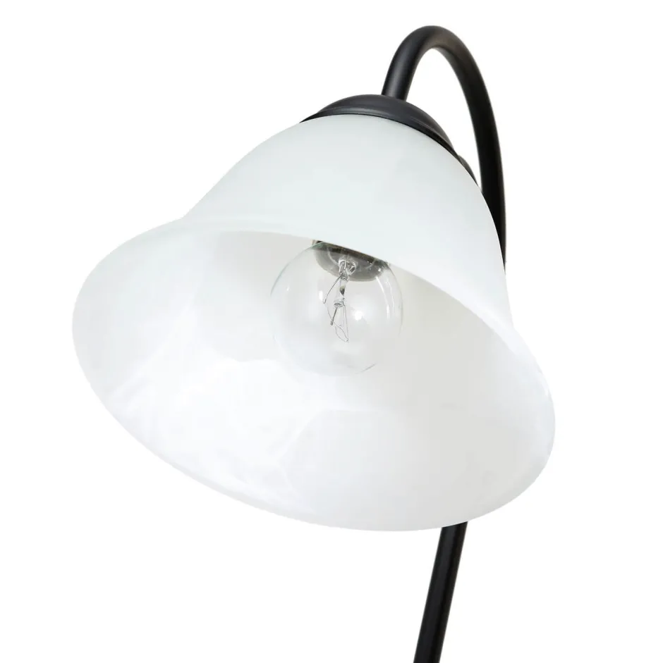 Das schwarze Metall erinnert an massives Schmiedeeisen, was den antiken Look der Tischleuchte weiter betont