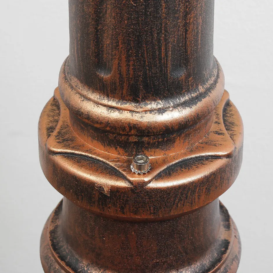 Die rustikale Außenstehleuchte in Kupfer Antik besteht aus witterungsbeständigem Aluminium und robustem Glas
