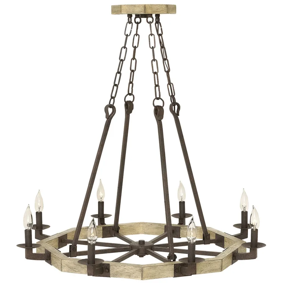 Der Materialmix von Eisen, Holz und Stoff bilden erinnert an den Wilden Westen und verleiht dem Lüster ein antikes Flair