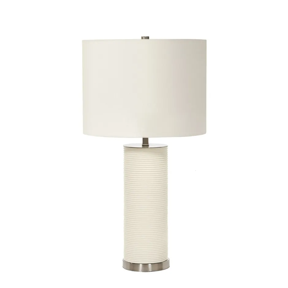 Der geradlinige Fuß mit seiner geriffelten Oberfläche verleiht der Tischlampe einen architektonischen Touch und macht sie in jedem Wohnzimmer, Schlafzimmer oder Büro zu einem dekorativen Blickfang