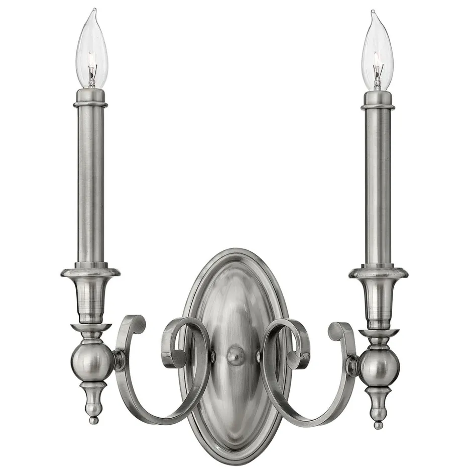 Die kunstvolle Bauart erweckt den Eindruck eines antiken Wandleuchters, was durch den besonderen Farbton Nickel weiter betont wird