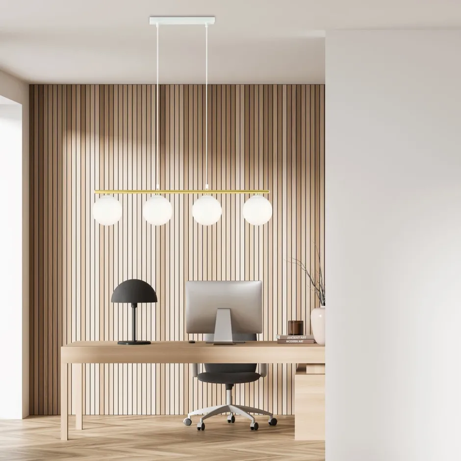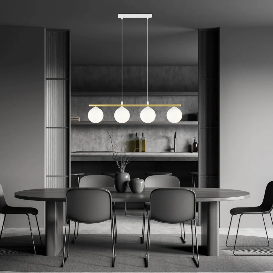 Die längliche Hängeleuchte sorgt für eine blendarme Beleuchtung und passt ideal über den Esstisch