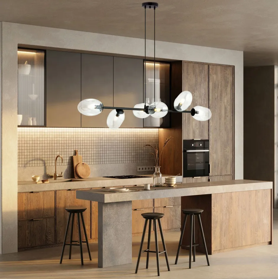Die längliche Hängeleuchte sorgt für eine direkte Beleuchtung und passt ideal über den Esstisch