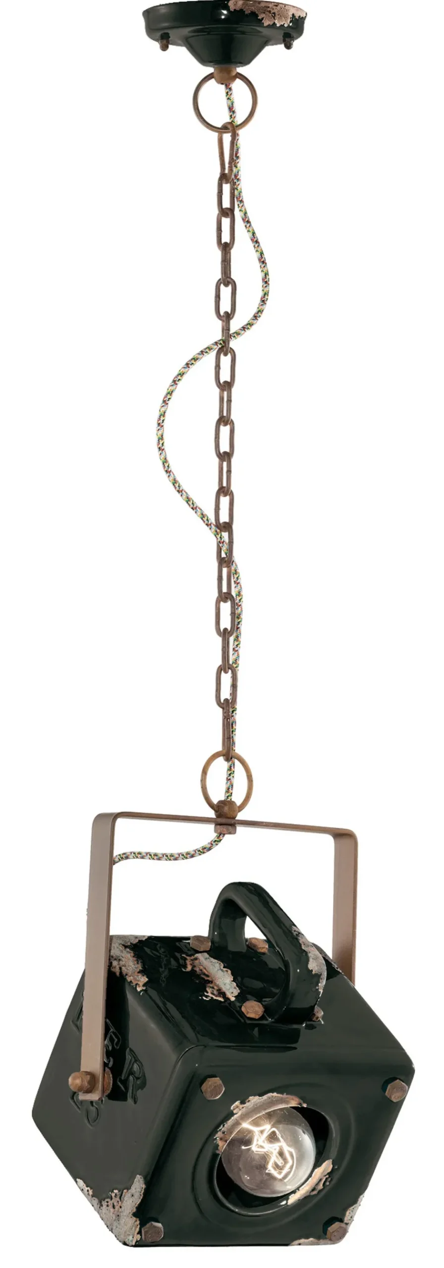 Die antik wirkende Oberfläche verleiht der Hängelampe einen einzigartigen Look, der in jedem Raum zu einem dekorativen Blickfang wird