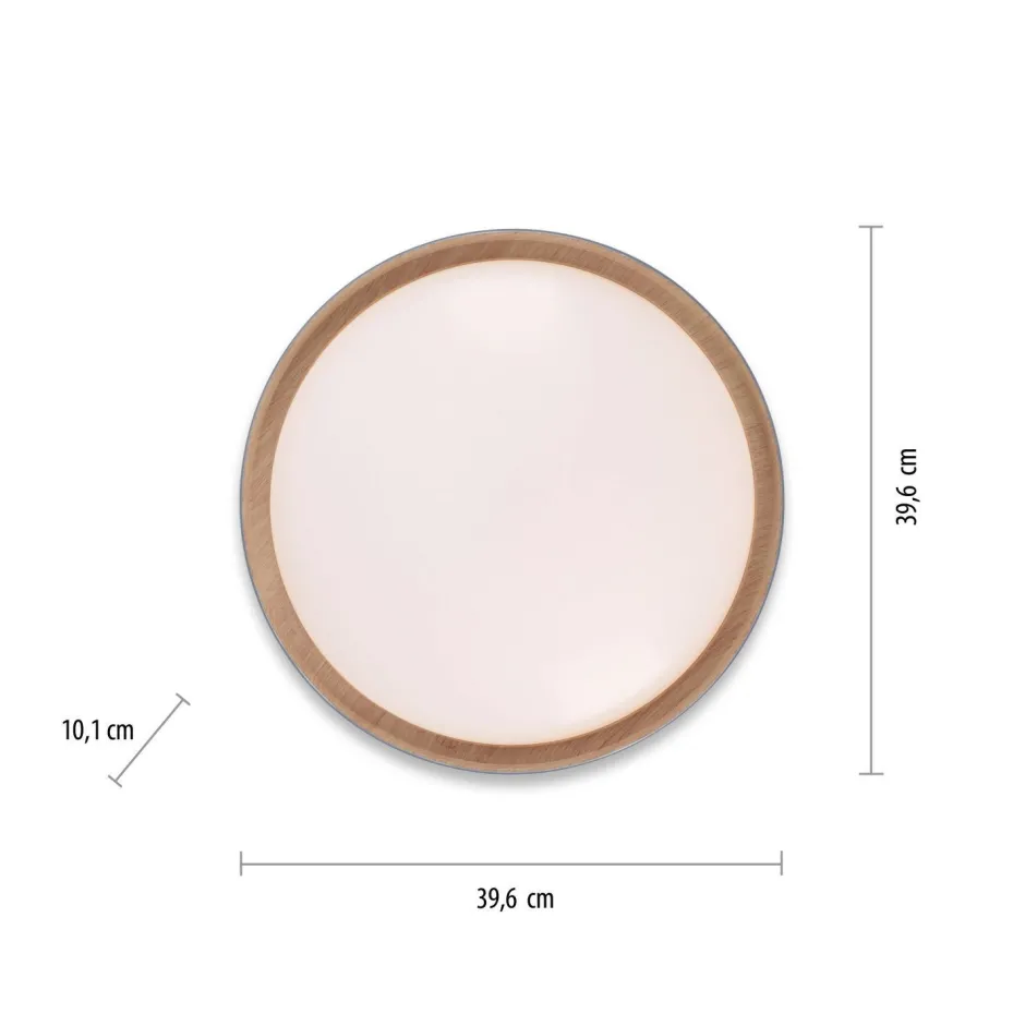 Der große Kunststoffschirm mit holzfarbener Innenseite streut das Licht blendarm für ein gemütliches Ambiente in Wohnzimmer, Schlafzimmer und Esszimmer