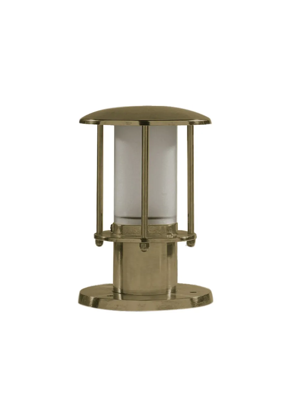 Die elegante Sockelleuchte aus massivem Messing und satiniertem Glas sorgt für eine großzügige Beleuchtung nach allen Seiten und erhellt Wege, Terrasse und Garten: für mehr Sicherheit auf dem Grundstück