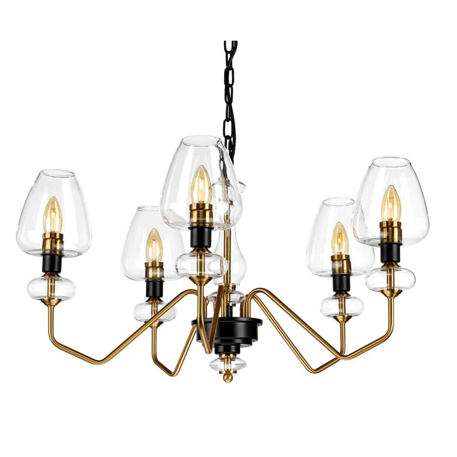 Die gebogenen Arme und die bauchigen Lampenschirme verleihen der Pendelleuchte einen eleganten Look, was durch die edlen Farben weiter betont wird