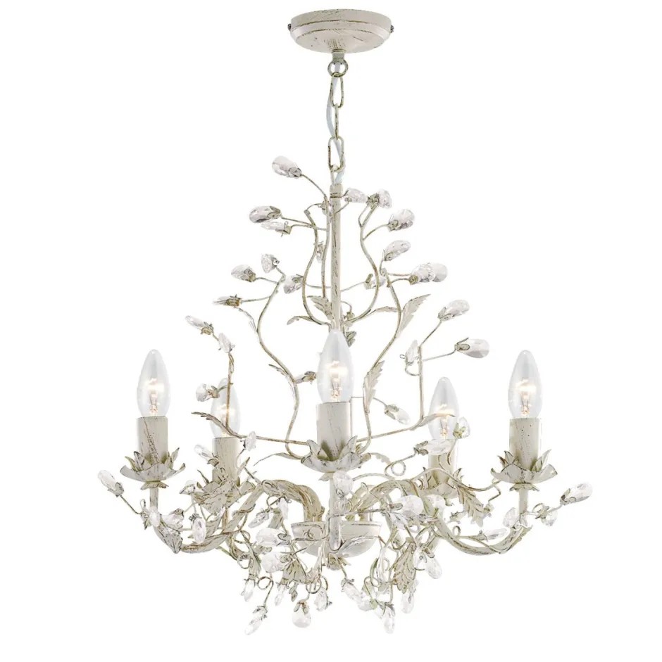 Der opulente Lüster besticht durch seine floralen Verzierungen und funkelnde Glaskristalle – ein dekoratives Highlight in jedem Schlafzimmer, Wohnzimmer und Esszimmer
