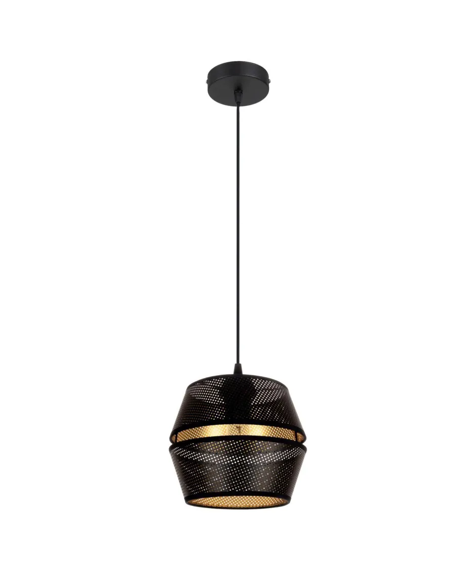 Qualität Made in EU Entdecke die Loft Hängelampe PATBOND – ein stilvolles Highlight für dein Zuhause! Mit ihrem eleganten Design aus schwarzem und goldfarbenem Metall zieht diese Pendelleuchte alle Blicke auf sich. Sie ist nicht nur ein funktionales Lichtobjekt, sondern auch ein echter Eyecatcher, der deinem Wohnraum eine besondere Note verleiht. Ob über dem Esstisch, in der Küche oder im Wohnzimmer – die PATBOND sorgt für eine einladende Atmosphäre. Mit einem Durchmesser von 200 mm und einer Hängetiefe von 900 mm ist diese Hängelampe ideal für hohe Decken geeignet. Die winzigen Löcher im Metallschirm kreieren ein einzigartiges Lichterlebnis, das jeden Raum in ein warmes Licht taucht. Die Lampe ist für den Innengebrauch (IP20) konzipiert und wird mit 230V betrieben. Sie benötigt lediglich ein E27 Leuchtmittel bis 60W, was dir die Freiheit gibt, die Lichtstimmung nach deinen Wünschen zu gestalten. Die PATBOND ist nicht nur eine der besten Pendelleuchten für dein Esszimmer, sondern auch eine stilvolle Küchenlampe und eine moderne Wohnzimmerlampe. Ihre hochwertige Verarbeitung „Made in EU“ garantiert Langlebigkeit und Qualität. Egal, ob du ein modernes, funktionales Design suchst oder einfach nur eine stilvolle Ergänzung für dein Zuhause – diese Hängelampe erfüllt all deine Ansprüche. Setze auf die Loft Hängelampe PATBOND und erlebe, wie sie dein Zuhause in ein stilvolles Licht taucht. Lass dich von der Kombination aus Funktionalität und Design inspirieren und genieße die perfekte Beleuchtung für jeden Anlass!