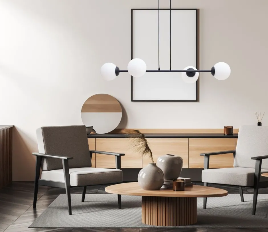 Qualität Made in EU Entdecke die moderne Hängelampe BEGSA – ein stilvolles Highlight für dein Zuhause! Mit ihrem eleganten Design aus schwarzem Metall und satinierten Glaskugeln bringt diese Lampe nicht nur Licht, sondern auch eine besondere Atmosphäre in jeden Raum. Ob über dem Esstisch im Esszimmer oder als Blickfang im Wohnzimmer, die BEGSA sorgt für ein warmes und einladendes Licht, das zum Verweilen einlädt. Mit einer Länge von 900 mm und einer Höhe von 850 mm ist diese Pendelleuchte ideal für hohe Decken geeignet. Die sanften Lichtakzente der Kugellampen schaffen eine harmonische Lichtstimmung, die sowohl funktional als auch ästhetisch überzeugt. Die Lampe ist für den Innenbereich (IP20) konzipiert und wird mit 230V betrieben. Sie bietet Platz für bis zu vier E27 Leuchtmittel mit einer maximalen Leistung von 60W, sodass du die Lichtintensität ganz nach deinen Wünschen anpassen kannst. Die BEGSA ist nicht nur eine Esstischlampe, sondern auch eine stilvolle Ergänzung für dein Wohnzimmer oder Büro. Ihr modernes Design und die hochwertige Verarbeitung „Made in EU“ garantieren Langlebigkeit und Qualität. Die Aufhängung erfolgt über ein selbsttragendes Kabel an einer Schwebeplattform, was der Lampe eine schwebende Leichtigkeit verleiht. Setze auf die BEGSA Hängelampe, um deinem Raum einen Hauch von skandinavischem Design zu verleihen. Sie vereint Funktionalität und Stil und ist die perfekte Wahl für alle, die Wert auf Qualität und Design legen. Lass dich von der BEGSA inspirieren und erlebe, wie sie dein Zuhause in ein gemütliches Licht taucht!