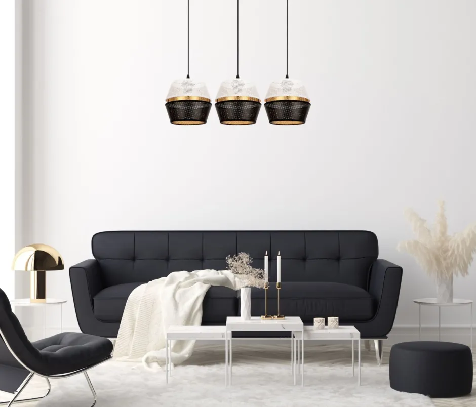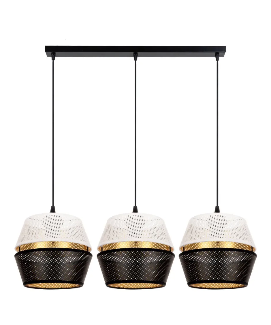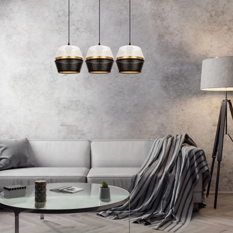 Qualität Made in EU Entdecke die Loft Pendelleuchte PATBOND – ein Meisterwerk aus Metall, das deinem Zuhause einen Hauch von Eleganz verleiht. Mit einer beeindruckenden Länge von 900 mm und einer Höhe von 700 mm ist diese mehrflammige Pendelleuchte nicht nur ein Blickfang, sondern auch ideal für hohe Decken. Die Kombination aus Schwarz, Weiß und Gold sorgt für ein stilvolles Ambiente, das sowohl in deinem Wohnzimmer als auch in der Küche oder im Esszimmer perfekt zur Geltung kommt. Die PATBOND Pendelleuchte überzeugt durch ihr einzigartiges Design: Die winzigen Löcher in den Metallschirmen schaffen ein faszinierendes Lichterlebnis, das jeden Raum in einladendes Licht taucht. Mit einer Hängetiefe, die sich perfekt an deine Bedürfnisse anpasst, wird diese Hängelampe zum Highlight über deinem Esstisch oder in deinem Wohnzimmer. Dank der IP20–Schutzklasse ist sie für den Innengebrauch geeignet und lässt sich problemlos mit 3x E27 Leuchtmitteln bis 60W betreiben. Die Qualität „Made in EU“ garantiert dir nicht nur Langlebigkeit, sondern auch ein durchdachtes Design, das sowohl funktional als auch ästhetisch überzeugt. Egal, ob du eine stilvolle Küchenlampe oder eine moderne Esstischlampe suchst – die PATBOND Pendelleuchte erfüllt all deine Ansprüche. Setze auf die perfekte Kombination aus Funktionalität und Design und bringe mit dieser Pendelleuchte Gold und Eleganz in dein Zuhause. Lass dich von der PATBOND inspirieren und genieße die harmonische Lichtstimmung, die sie verbreitet.