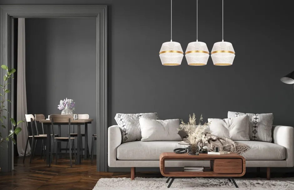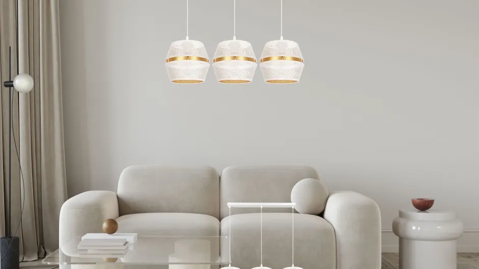 Qualität Made in EU Entdecke die Loft Pendelleuchte PATBOND – ein stilvolles Highlight für dein Zuhause! Mit ihrem eleganten Design aus hochwertigem Metall in Weiß und Gold bringt diese Pendelleuchte nicht nur Licht, sondern auch eine besondere Atmosphäre in jeden Raum. Ob im Wohnzimmer, in der Küche oder über dem Esstisch, die PATBOND ist die perfekte Wahl für alle, die Wert auf Ästhetik und Funktionalität legen. Mit einer Länge von 900 mm und einer Höhe von 700 mm eignet sich diese Hängelampe ideal für hohe Decken. Die große Hängetiefe sorgt dafür, dass das Licht gleichmäßig verteilt wird und eine einladende Stimmung erzeugt. Die winzigen Löcher in den Metallschirmen kreieren ein einzigartiges Lichterlebnis, das deine Räume in ein warmes, gemütliches Licht taucht. Dank der IP20–Schutzklasse ist die Lampe perfekt für den Innenbereich geeignet und wird mit 230V betrieben. Sie ist für bis zu drei E27-Leuchtmittel mit einer maximalen Leistung von 60W ausgelegt, sodass du die Lichtstimmung ganz nach deinen Wünschen anpassen kannst. Die PATBOND Pendelleuchte ist nicht nur ein echter Blickfang, sondern auch ein Zeichen für Qualität – Made in EU. Sie vereint modernes skandinavisches Design mit praktischen Eigenschaften, die sowohl stilbewusste als auch budgetbewusste Käufer ansprechen. Ob du eine elegante Esszimmerlampe oder eine funktionale Küchenlampe suchst, die PATBOND wird deinen Ansprüchen gerecht. Fazit: Setze mit der Loft Pendelleuchte PATBOND stilvolle Akzente in deinem Zuhause und genieße ein einzigartiges Lichterlebnis. Lass dich von der Kombination aus Funktionalität und Design inspirieren und verwandle deine Räume in Wohlfühloasen!