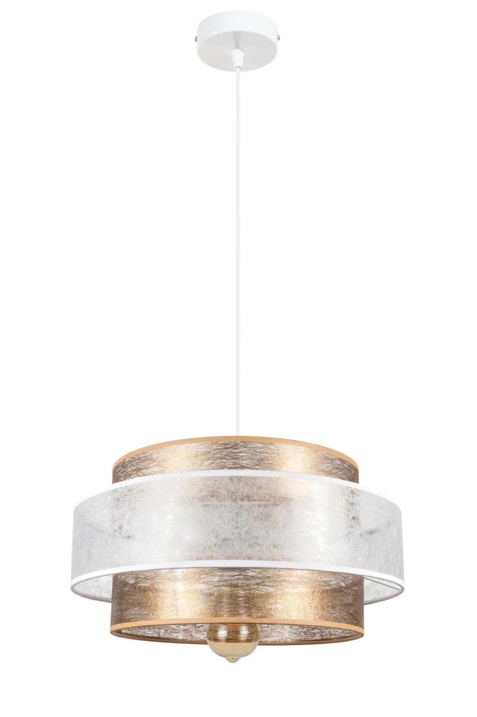 Moderne Pendelleuchte aus Metall und Stoff in Weiß und Gold