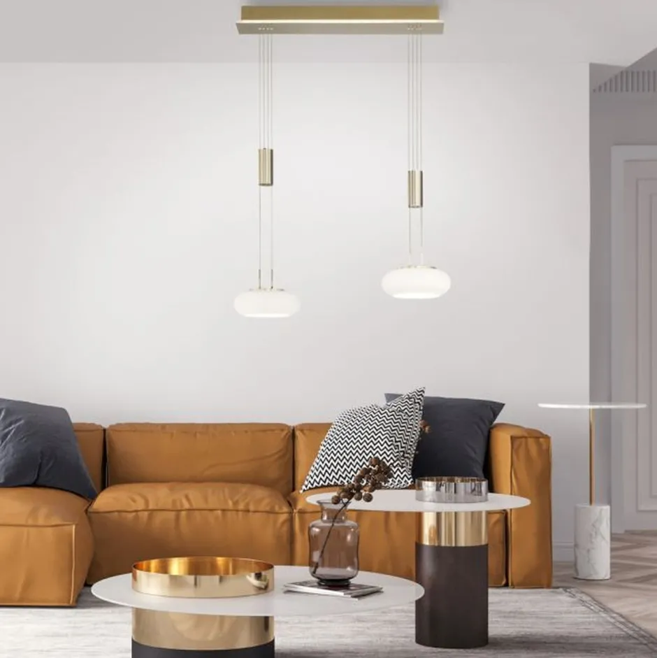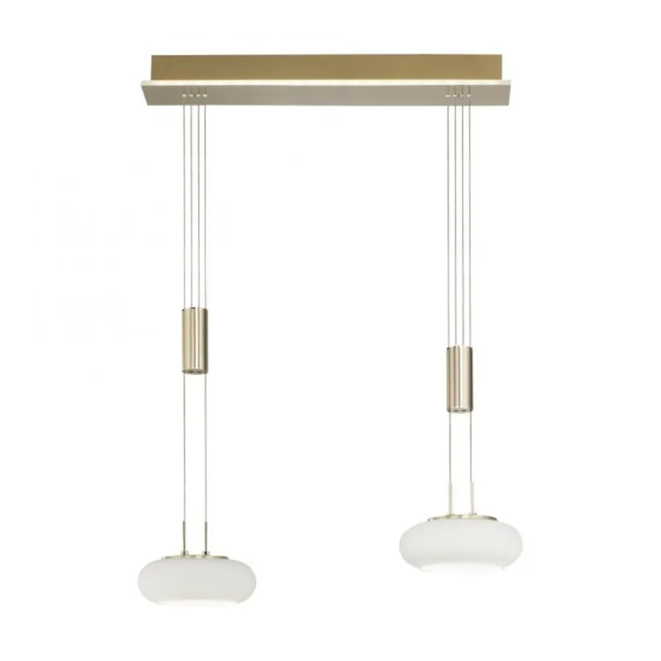Moderne LED Pendelleuchte mit satinierten Glasschirmen in Messing