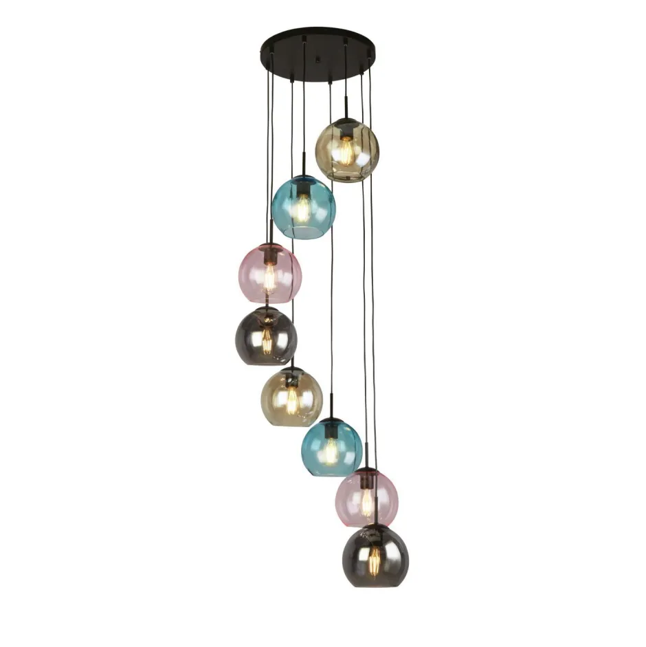 Farbenfrohe Pendelleuchte mit Kugelschirmen aus Glas