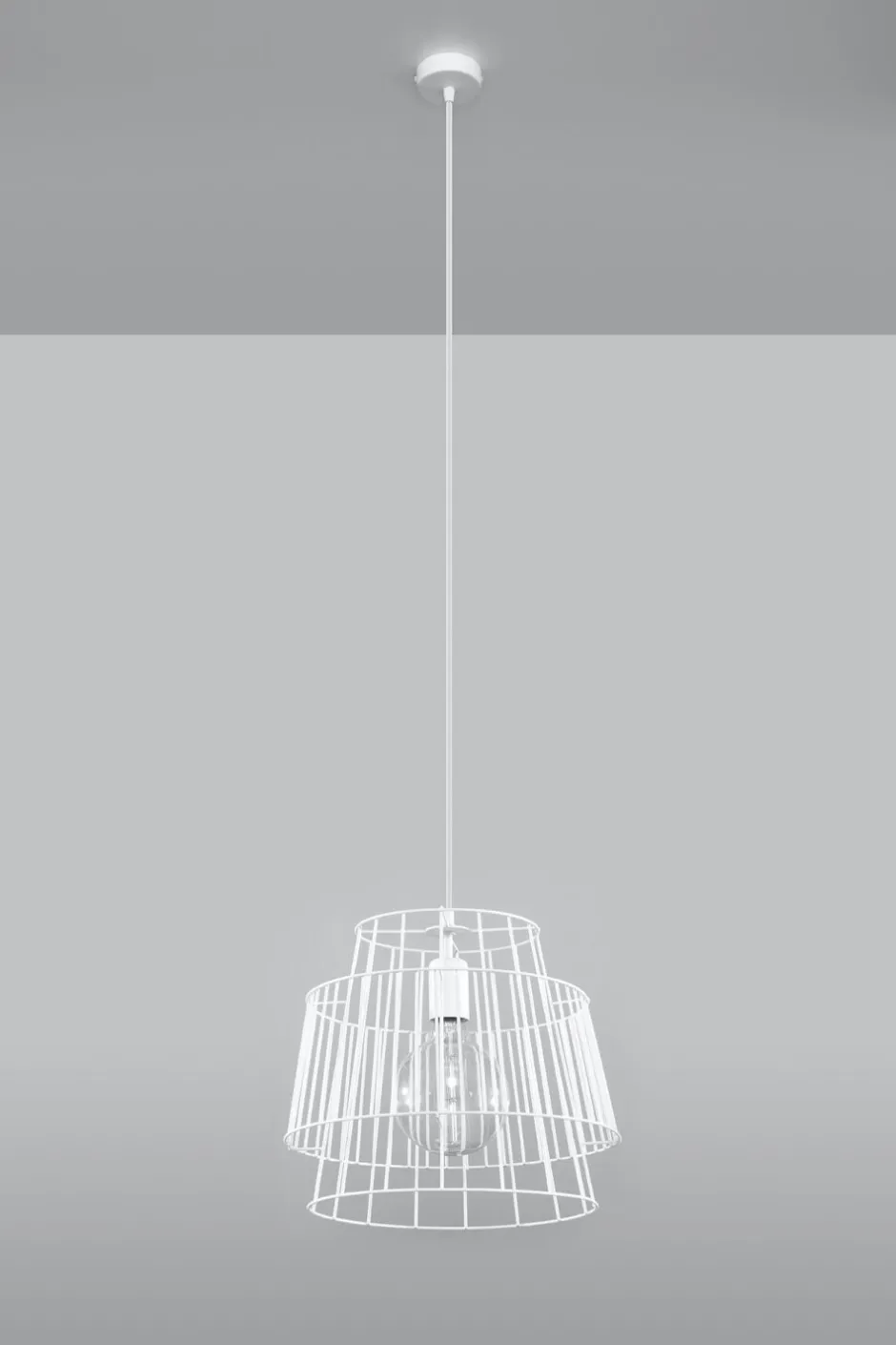 Der käfigartige Lampenschirm setzt das frei sichtbare Leuchtmittel besonders in Szene