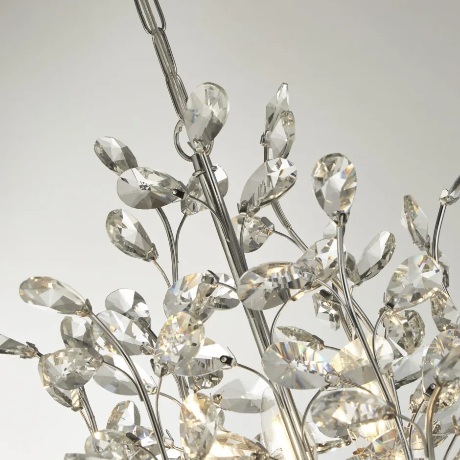 Der opulente Lüster besticht durch seine floralen Verzierungen und funkelnde Glaskristalle – ein dekoratives Highlight in jedem Schlafzimmer, Wohnzimmer und Esszimmer
