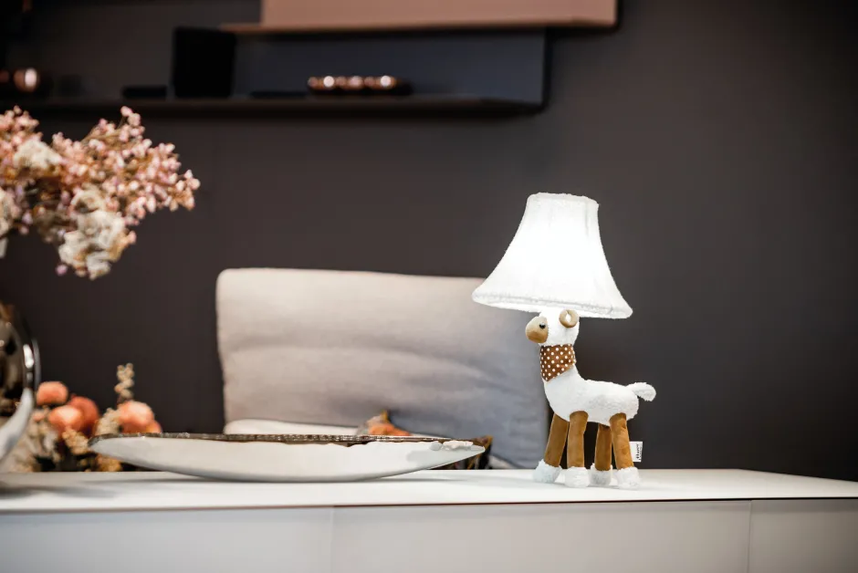 Flauschiger geht es nicht: Das kleine Schaf lädt zum knuddeln ein und macht aus der Tischleuchte einen ganz besonderen Blickfang, der Jung und alt begeistert.