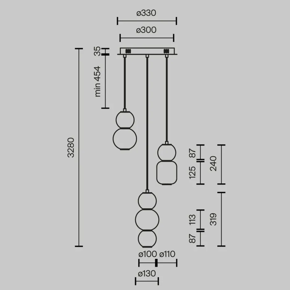 | Maße: | Breite: 380 mm | Hängetiefe: 454-3354 mm | Länge: 380 mm | Durchmesser Sockel/Wandhalterung: 330 mm |