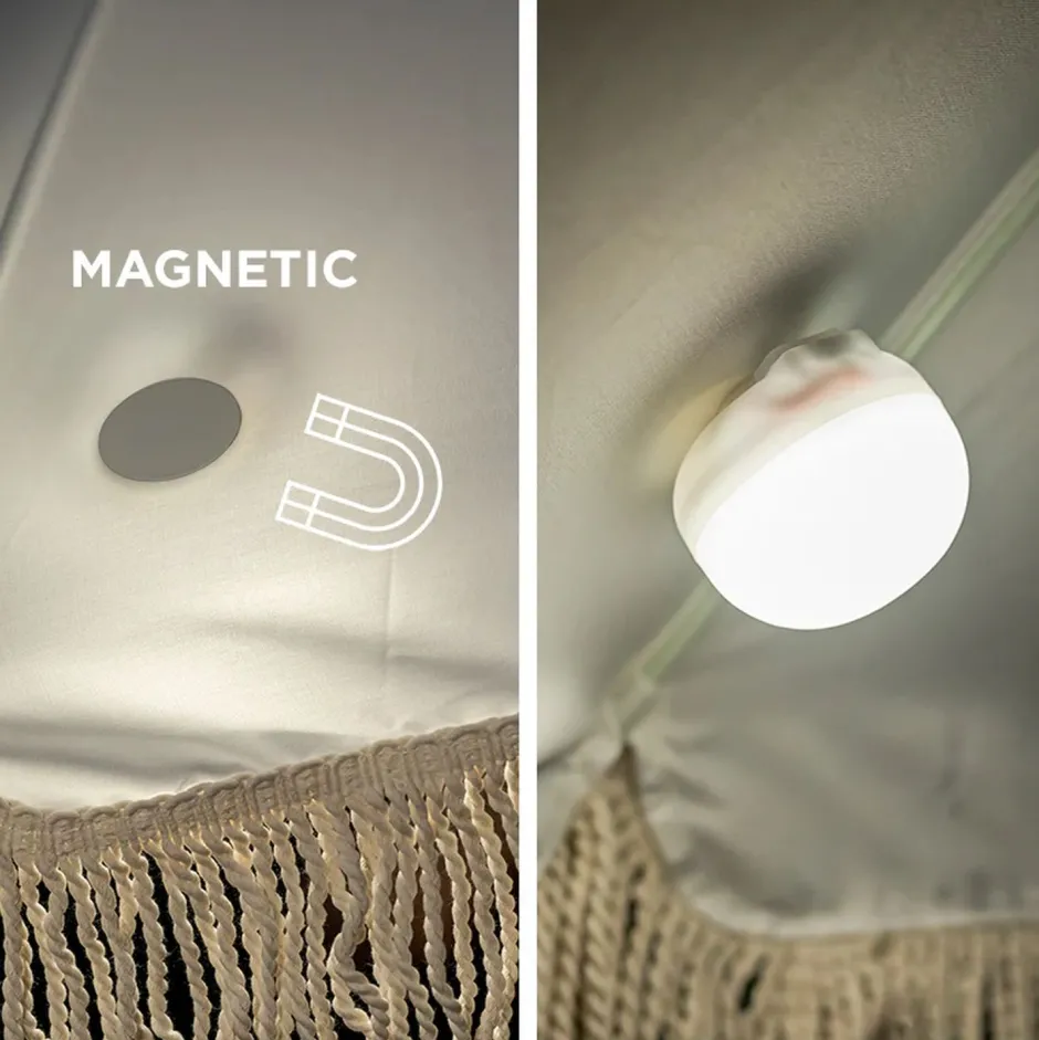 Egal ob an einem Ast im Baum, unter dem Sonnenschirm oder am Geländer, die tragbare LED Lampe kann per Magnet oder Haken einfach und unkompliziert montiert werden – ein praktischer Lichtbringer für jeden Außenbereich