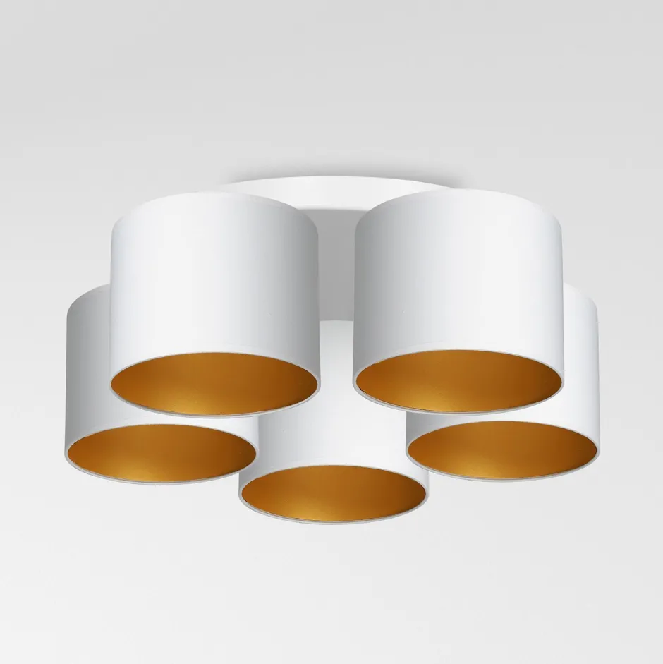 Zeitlose Deckenleuchte aus lackiertem Stahl, Stoff und Kunststoff in Weiß und Gold