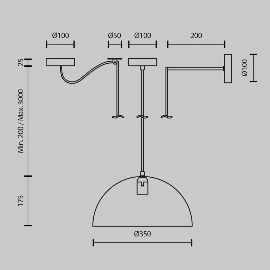 | Maße: | Breite: 350 mm | Hängetiefe: 400-3200 mm | Länge: 350 mm | Durchmesser: 350 mm | Durchmesser Sockel/Wandhalterung: 100 mm |
