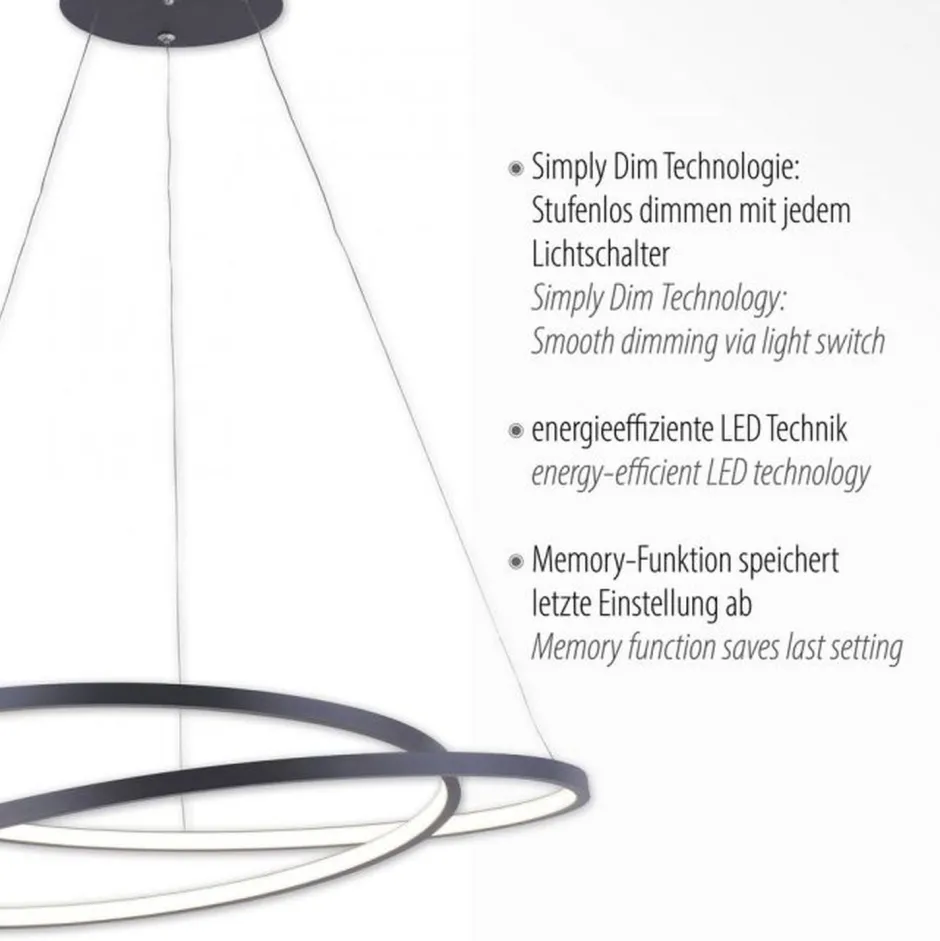 Die eleganten Leuchtringe der Pendelleuchte sorgen für ein einzigartiges Lichtspiel – perfekt über dem Esstisch in Wohnzimmer, Esszimmer und Küche