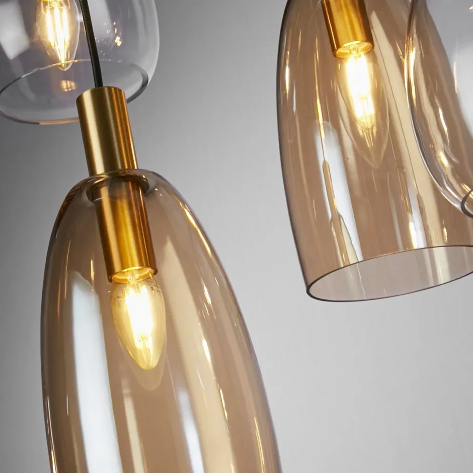 Große Pendelleuchte mit bunten Lampenschirmen aus Rauchglas