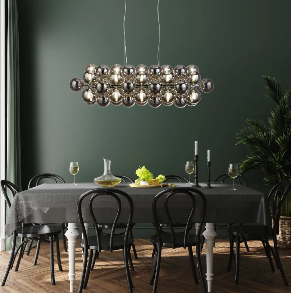 Das Rauchglas unterstreicht den dekorativen Charakter und setzt einen modernen Farbakzent in Wohnzimmer und Esszimmer