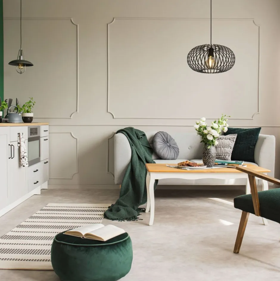 Der offene Draht Schirm macht die Pendelleuchte zu einem dekorativen Highlight in Wohnzimmer, Küche und Esszimmer