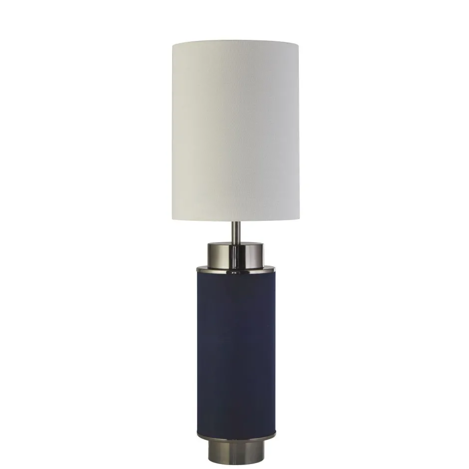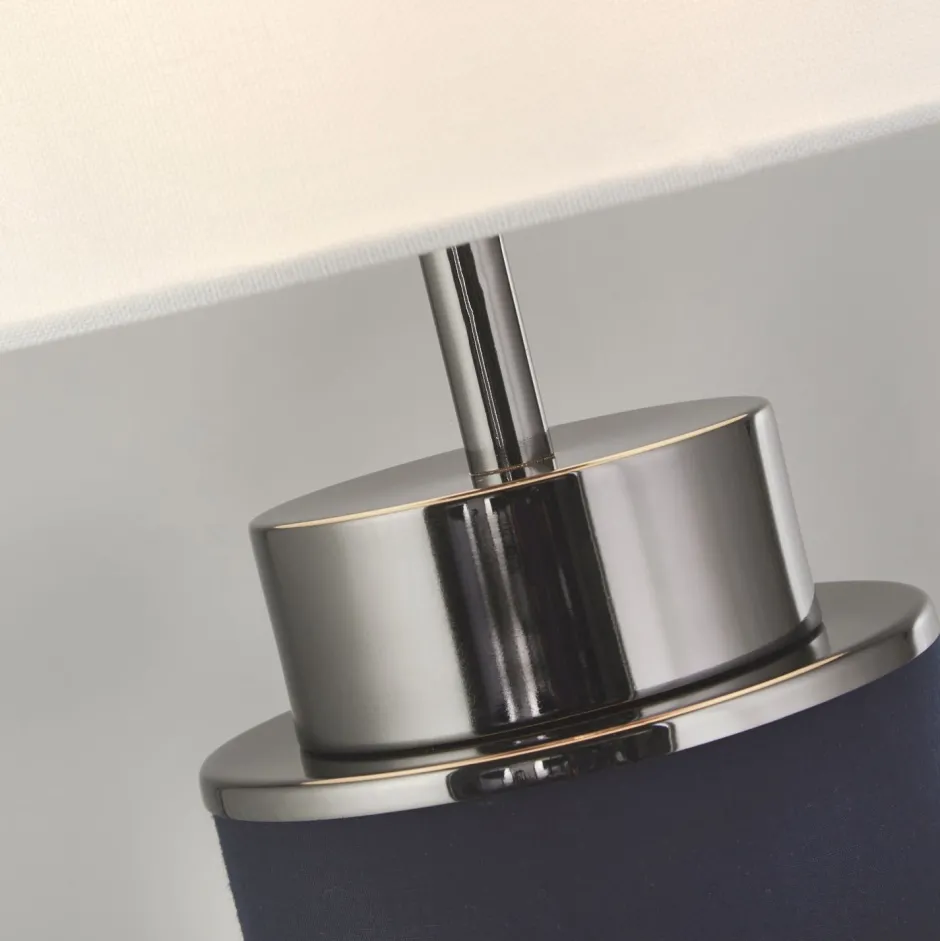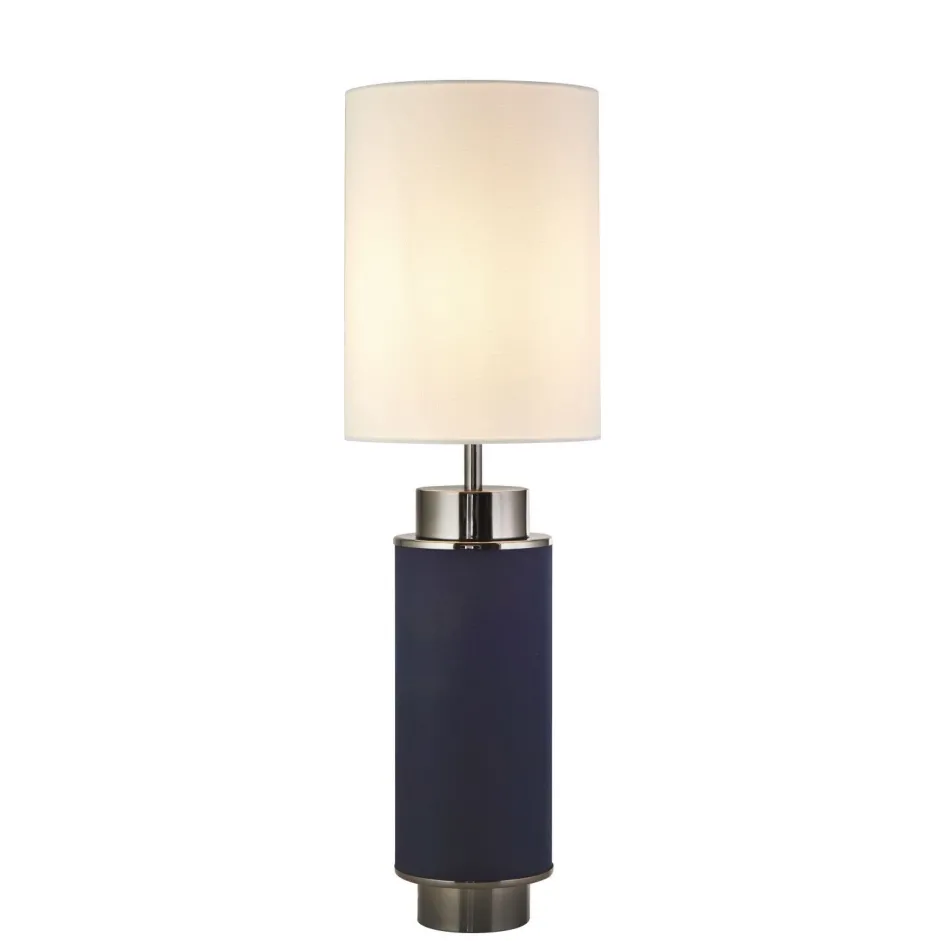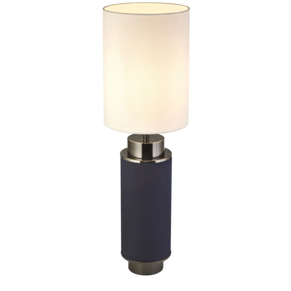 Das dunkle Blau in Kombination mit Akzenten in Nickel verleiht der Tischlampe einen edlen Look, der auch in Hotels und Restaurants für ein besonderes Ambiente sorgt