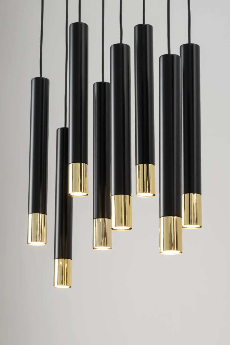 Große Pendelleuchte mit schmalen Zylinder Lampenschirmen in Schwarz und Gold