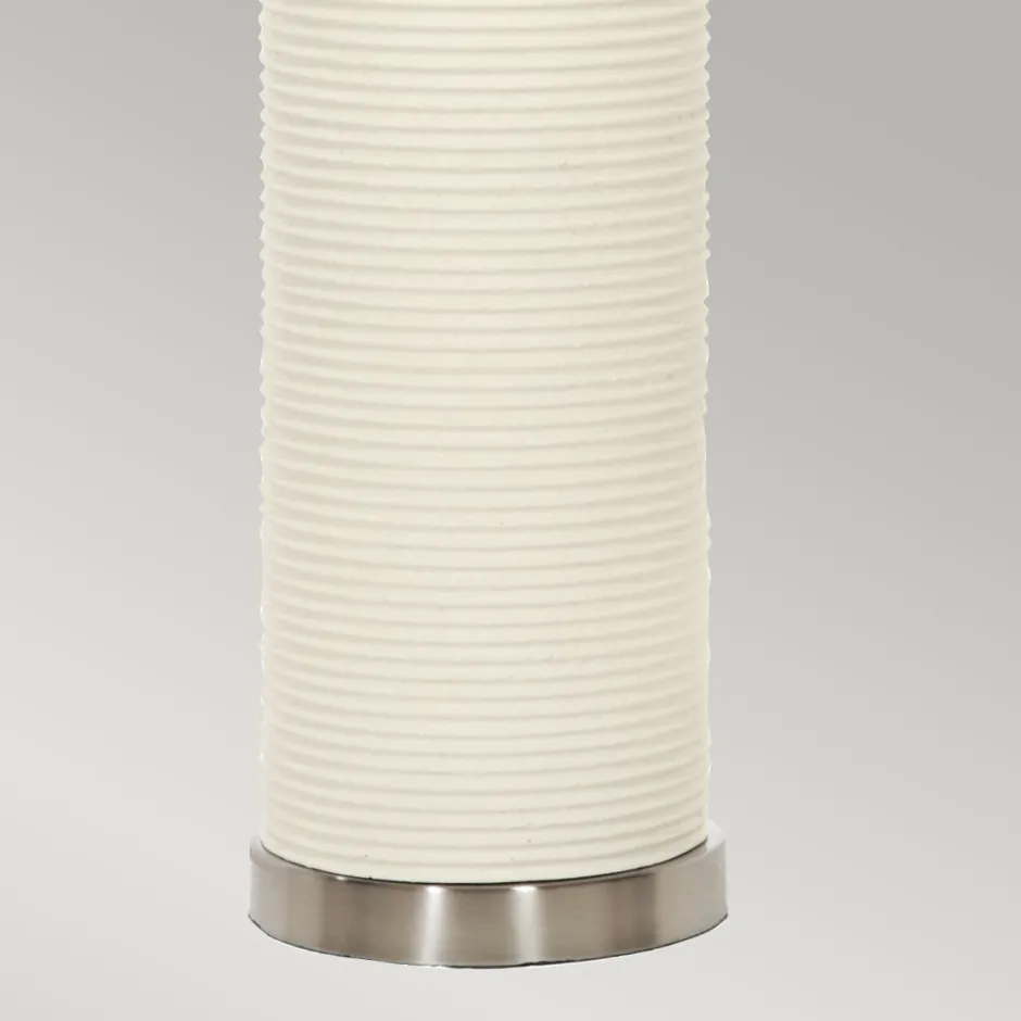 Der geradlinige Fuß mit seiner geriffelten Oberfläche verleiht der Tischlampe einen architektonischen Touch und macht sie in jedem Wohnzimmer, Schlafzimmer oder Büro zu einem dekorativen Blickfang