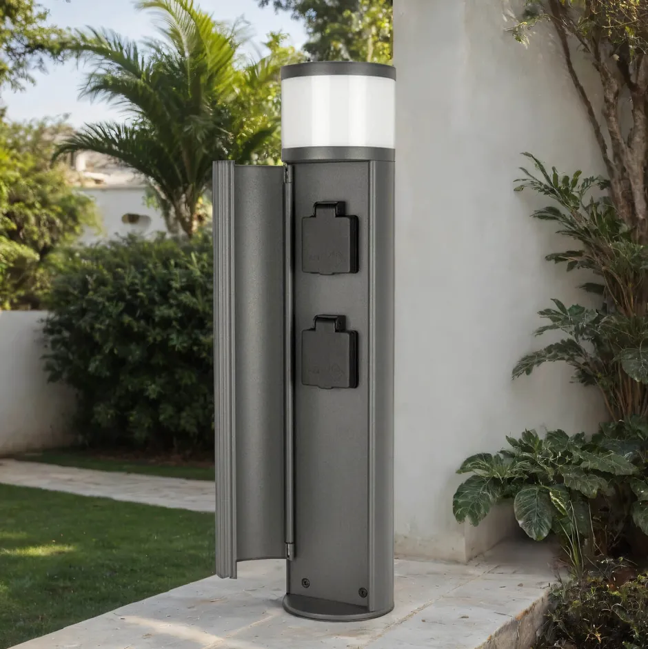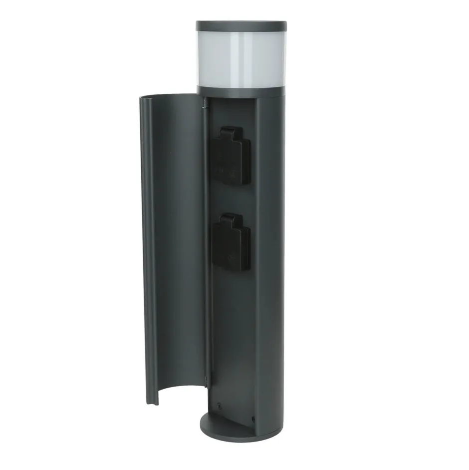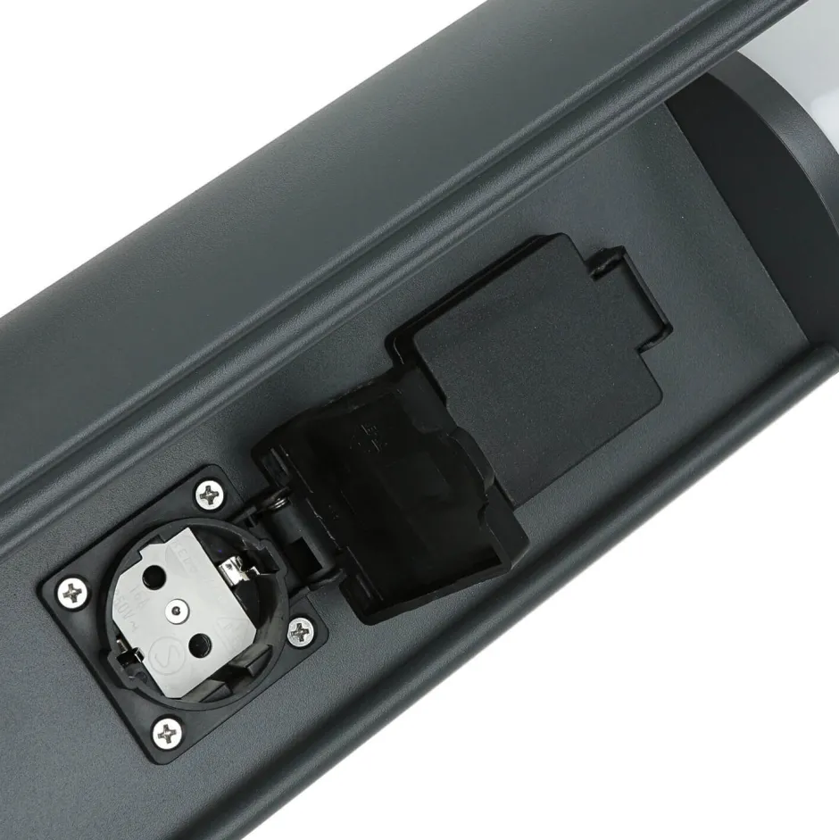 Praktische Kombination aus Außenleuchte und Stromsäule: hinter der Klappe verbergen sich 2 geschützte Steckdosen zur Stromversorgung weiterer elektronischer Geräte