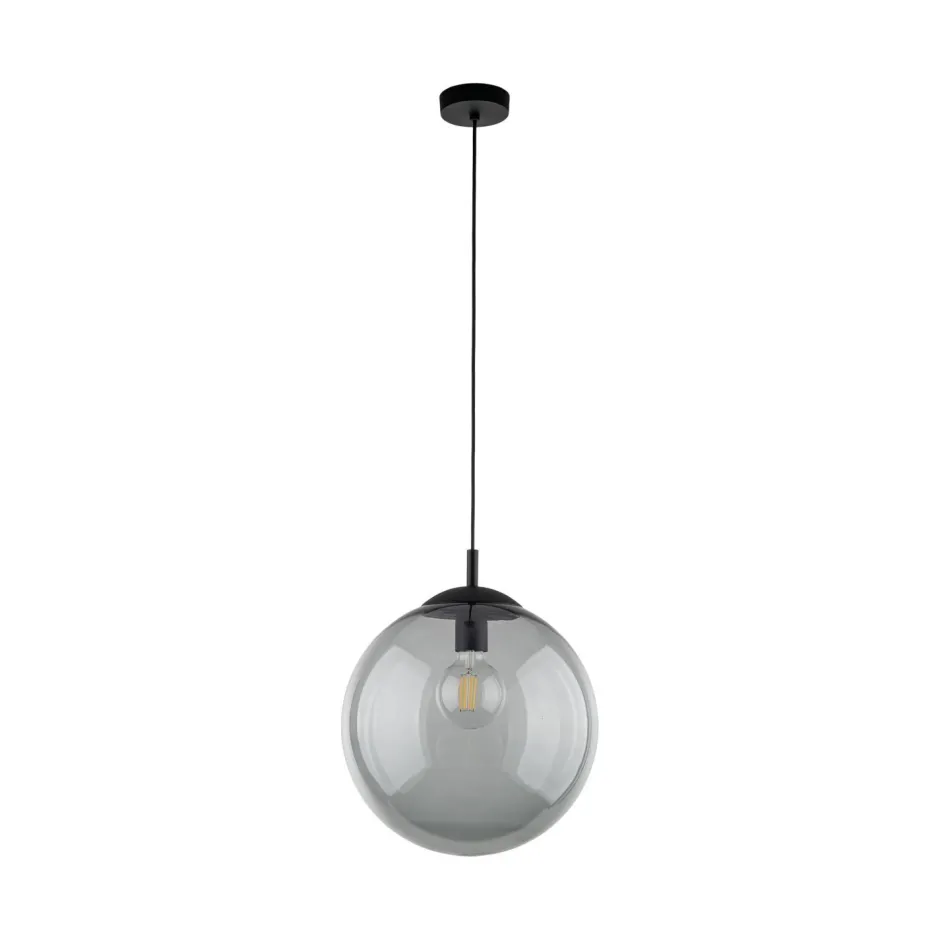 Schmale Pendelleuchte mit Kugelschirm aus Rauchglas