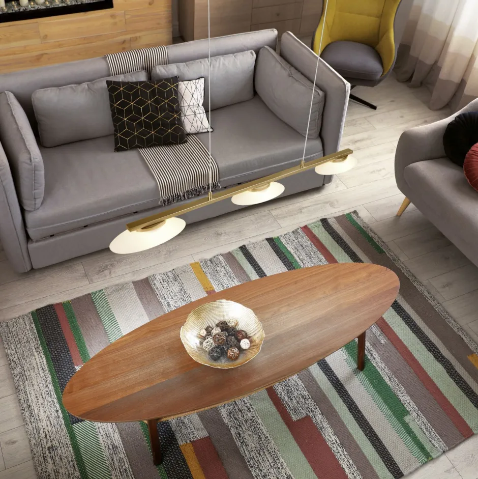 Die flachen Glasschirme sorgen für sanftes Licht über dem Esstisch in Wohnzimmer und Esszimmer